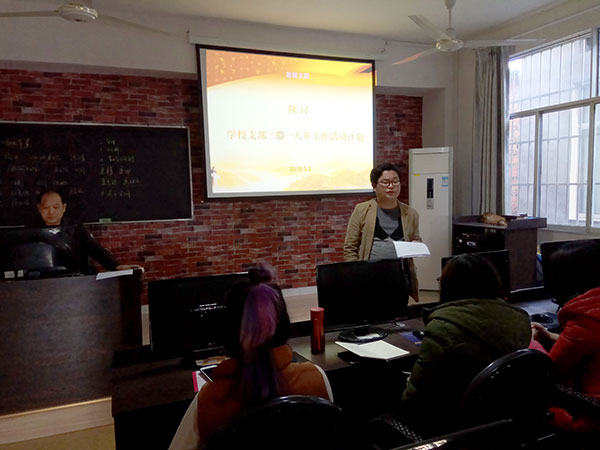 2018年3月2日,学校支部开展了主题党日,学校支部书记简开健同志领学了《开启新时代、踏上新征程》的十九大报告辅导内容,组织全体党员对学校支部2018年工作计划进行了审议,本次活动还举行了“党建+‘送知识 送科技’下乡活动”的启动仪式。