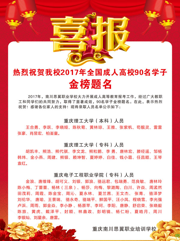 热烈祝贺我校2017年成人高校90名学子金榜题名