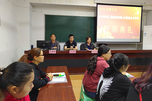 2019年第2期创业培训+计算机信息化办公开班典礼,2019年5月28日第2期创业培训+计算机信息化办公在学校综合教室一举行开班典礼,人社局督察蹇林航老师和学校领导一同参加,典礼上莫阳敏校长